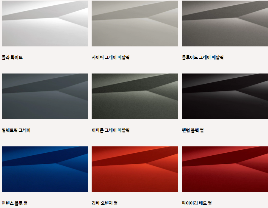 컬러 팔레트는 무난한 폴라 화이트 컬러부터 다양한 톤의 그레이 컬러를 갖추고 있으며, 블루와 오렌지, 레드로 총 9가지 색상 중 선택할 수 있어 사용자가 자신만의 매력을 충분히 뽐낼 수 있는 베리에이션입니다.