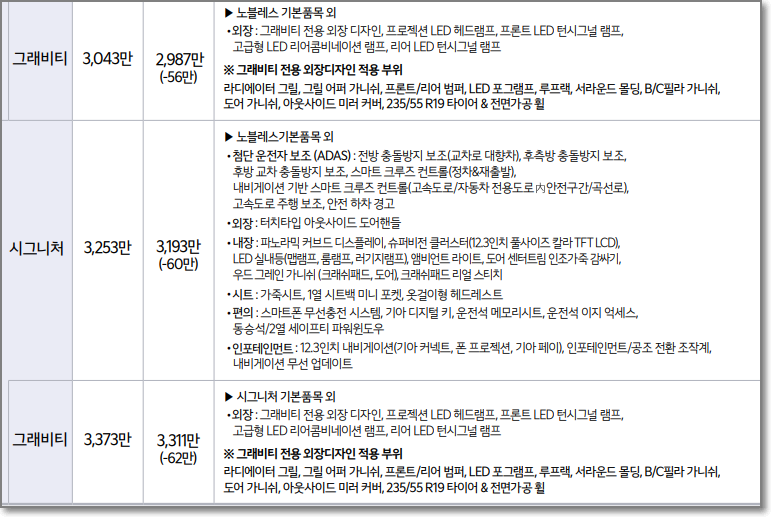 하이브리드는 제일 하위 트림인 트렌디를 제외하고 프레스티지 모델부터 노블레스, 시그니처를 택해볼 수 있다는 것도 알아두시면 도움이 되겠는데요. 프레스티지 3천109만 원 노블레스 3천269만 원 시그니처 3천593만 원입니다. 물론 사용자가 택한 옵션에 따라 가격에는 차이가 있을 수 있습니다.