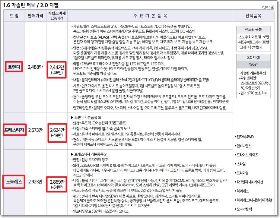 만약 풀옵션 차량을 택한다면 시그니처 모델에 그 외 옵션들을 더해 3천6백만 원 중반대를 지불하고 스포티지를 구입하게 되는 셈인데요. 상위 모델을 넘볼 수 있는 금액이니만큼 선택하실 때 심사숙고해 보시는 것도 나쁘지 않습니다. 사실 트렌디 깡통과 풀옵션의 차이가 1천2백만 원 정도가 나기 때문에 대체적으로 제가 알아본 가성비 수준에서 계약을 하시거나, 아예 풀 옵션으로 가는 추세라고 하는데요. 이는 개인의 취향에 따라 선택하셔야 할 문제이고요. 제 개인의 사견을 보탠다면 무난한 가성비 옵션을 선택하셔서 내 입맛에 맞는 나만의 차량을 만들어 보시는 것도 좋겠습니다.