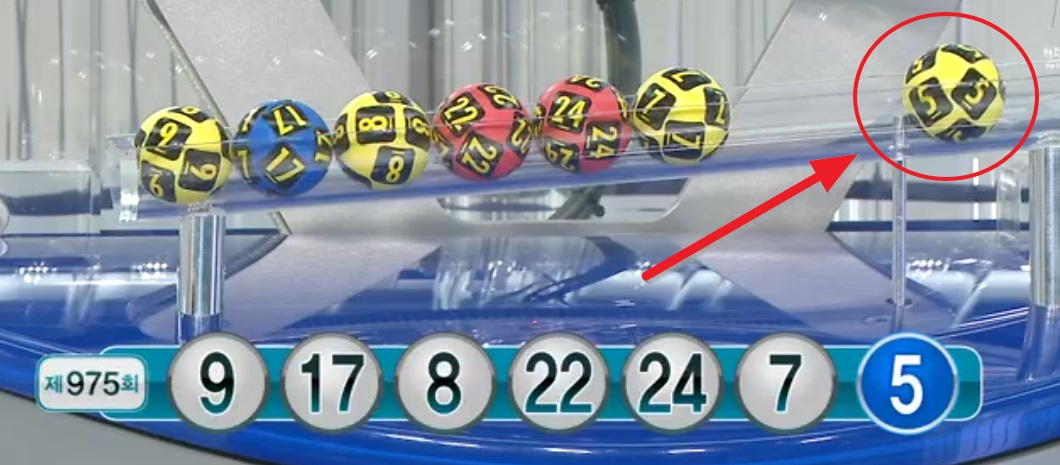 이 추첨기계는 공기 혼합방식에 의한 드럼링 회전추출방식(Drum Catch)을 통해 당첨볼을 추출하며 통 자체가 투명하게 되어있어서 공이 나오는 모습을 관객들이 볼 수 있습니다. 이 기계를 통해서 이번 975회에 공이 나온 순서를 보면 9, 17, 8, 22, 24, 7번의 순서로 나왔으며 보너스볼도 따로 추첨하는 것이 아니라 6번째 공 다음에 바로 공을 뽑는 방식입니다. 다만 보너스볼을 시각적으로 혼동을 주지 않기 위해서 7번째 공인 보너스볼이 나오기 전에 추첨기계의 밑에서 칸막이가 올라와 보너스볼을 따로 떨어져서 보이게 연출을 합니다. 따라서 9, 17, 8, 22, 24, 7, 5번의 순서로 공이 나온 것입니다.