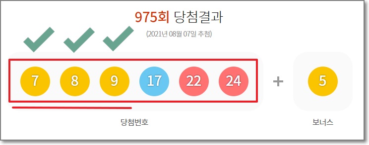 이번에는 특이하게도 3 연속 숫자가 당첨번호에 들어있는데요. 7,8,9번이 그것입니다.