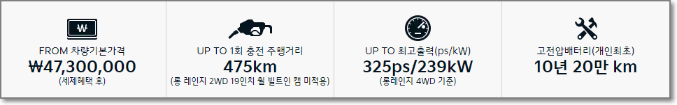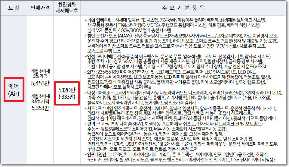 long range 모델은 역시 친환경차 세제 혜택 후에 5120만 원이며 주행거리는 450km 전후입니다.
