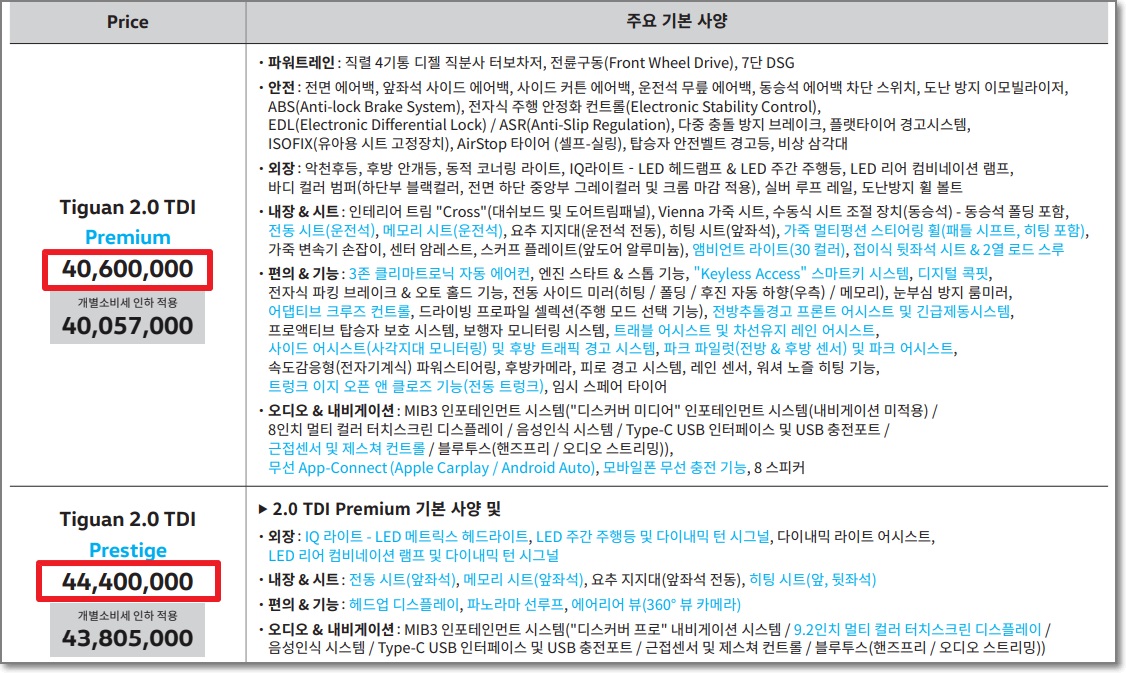 한편 권장 소비자 가격을 자세히 살펴보면 프리미엄과 프레스티지 트림의 가격 차이가 고작 320만 원이라는 사실을 쉽게 눈치챌 수 있습니다. 실제로 보이는 외견의 차이도 있는 바, 만일 티구안의 오너가 되고자 하시는 분이라면 조금 욕심내어 상위 트림을 선택해 보시는 것도 좋지 않을까 싶습니다.