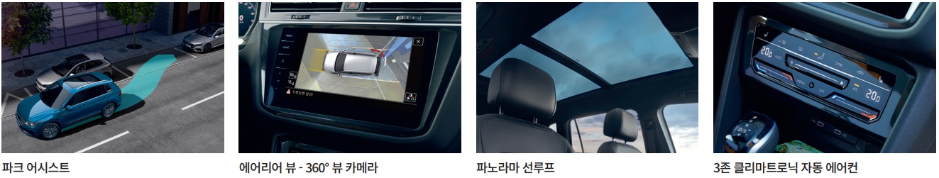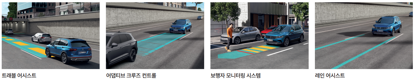 프레스티지 기준 사용자의 주행 편의성을 높인 옵션이 들어가 있다는 것도 매력이 큽니다. 고속도로와 잘 정비된 국도에서 앞차와의 거리를 고려해서 속도와 차로를 유지하여 운전의 난이도를 낮추어줄 트래블 어시스트, 도심이든 고속도로든 관계없이 전방 주행차량의 속도에 맞게 차량의 속도를 제어하고 설정한 거리를 유지하는 어댑티브 크루즈 컨트롤, 전방 카메라와 레이더 센서를 사용하여 보행자를 감지하고 충돌이 예상되는 경우 계기판에 표시와 동시에 소리를 내어 경고를 하면서 긴급 제동까지 스스로 하여 사고 발생 가능성을 줄여주는 보행자 모니터링 시스템, 차선 이탈에 의한 사고를 예방하는데 도움을 주는 차선 유지 시스템(레인 어시스트)이 들어가 있으니, 폭스바겐 티구안 신형. 이번에 칼을 제대로 갈고 출시한 게 아닐까 싶습니다. 패밀리카로서의 운용에 다소 아쉬움이 느껴졌던 부분을 전부 개선해 나왔으니 말입니다.