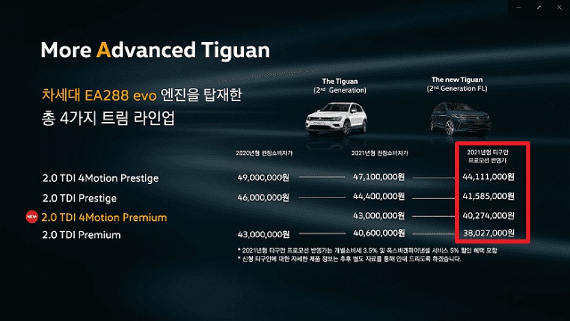 전륜 기준으로 폭스바겐 티구안 신형 출시 가격은 다음과 같습니다. 2.0 TDI 프리미엄 등급 4,060만 원, 프레스티지 기준 4,440만 원이지요. 경우 프리미엄 4,300만 원, 프레스티지 4,710만 원으로 가격이 정해져 있습니다. 참고로 이는 개별소비세를 적용하지 않은 금액이며 올해 12월까지 출고하는 차의 경우 개소세 인하를 적용받을 수 있다는 팁도 전해드리며 또한 프로모션이 적용된 실제 구입 가격은 4개의 모델이 하위 트림부터 각각 3802만 7천 원, 4천27만 4천 원, 4158만 5천 원, 4411만 1천 원으로 기본 모델의 경우 3천만 원대 후반에 구매할 수 있으므로 메리트가 있다고 할 수 있습니다.
