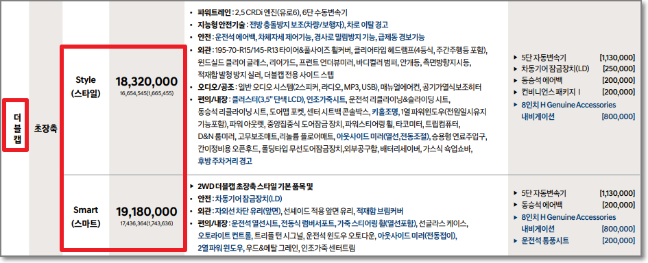 타 모델들도 편의 및 안전 옵션을 더하면서 상위로 올라가니 자세한 내용은 공식 홈페이지를 참고하셔도 좋겠습니다. 나머지 더블캡과 일반캡 가격 정리해 드립니다.
