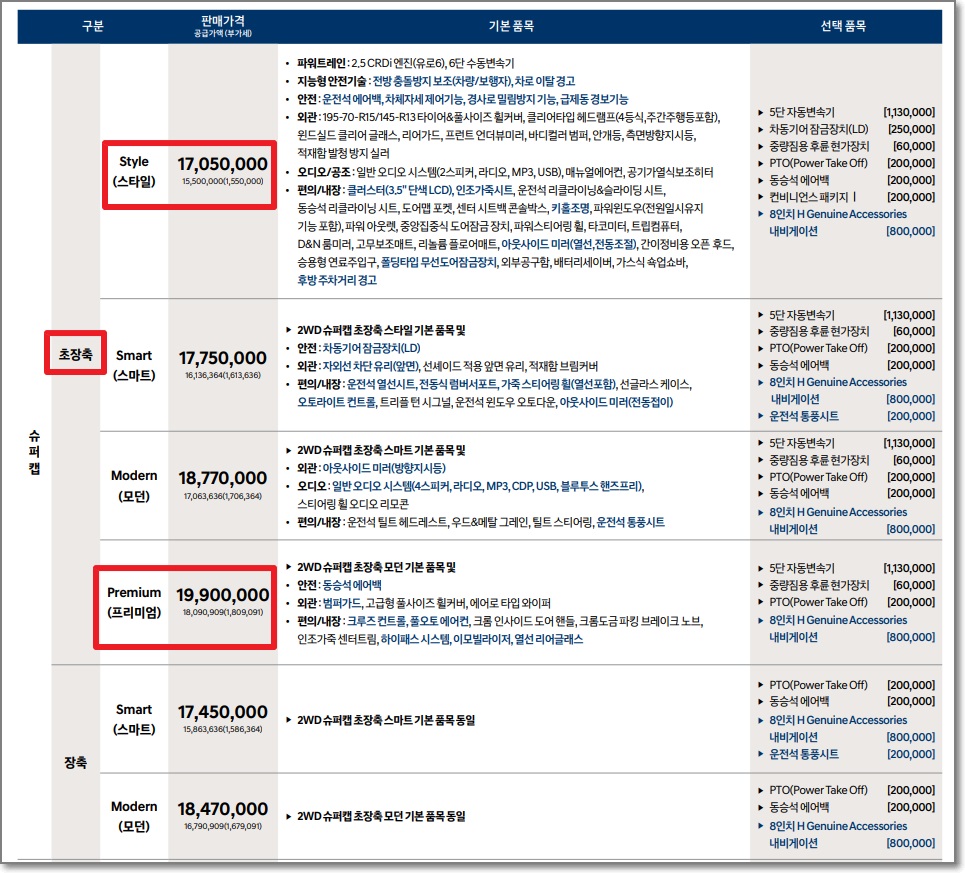 분류 2.5 CRDi 엔진 장축 일반캡_4WD 전용 장축 슈퍼캡 장축 더블캡 초장축 일반캡 초장축 슈퍼캡 초장축 더블캡