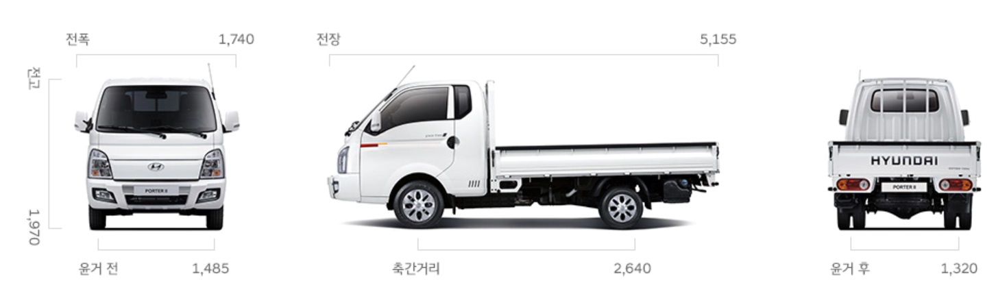 1톤 트럭인 포터의 경우 트림별로 다양한 모델을 내놓고 있습니다. 이는 사용자의 용도에 따라 알맞은 선택을 할 수 있게끔 하겠다는 현대자동차의 전략인데요. 실제로 탑승 인원의 수부터 화물 적재용량까지 차이를 두었고, 이는 해당 차량이 다양한 방면에서 활약할 수 있게끔 할 수 있었던 1등 공신이 아니었나 생각합니다. 2022 신형 포터 2의 제원을 보겠습니다. 2.5 CRDi 엔진 강화 유로 6모델 기준으로, 전장은 5,155mm 전폭은 초장축 슈퍼캡 범퍼가드 장착 유무에 따라 1,740mm에 달합니다. 앞바퀴 사이의 폭인 윤거전은 1,485mm이며 뒷바퀴 사이 폭인 윤거 후는로 운행에 안정성을 더합니다. 탑승석 기준 전고는 1,970mm로 넉넉한 편인데요. 승용차라면 휠베이스의 변화에 따라 적재 용량이 달라졌을 축거 부분은 2,640mm임을 확인해 볼 수 있었습니다.