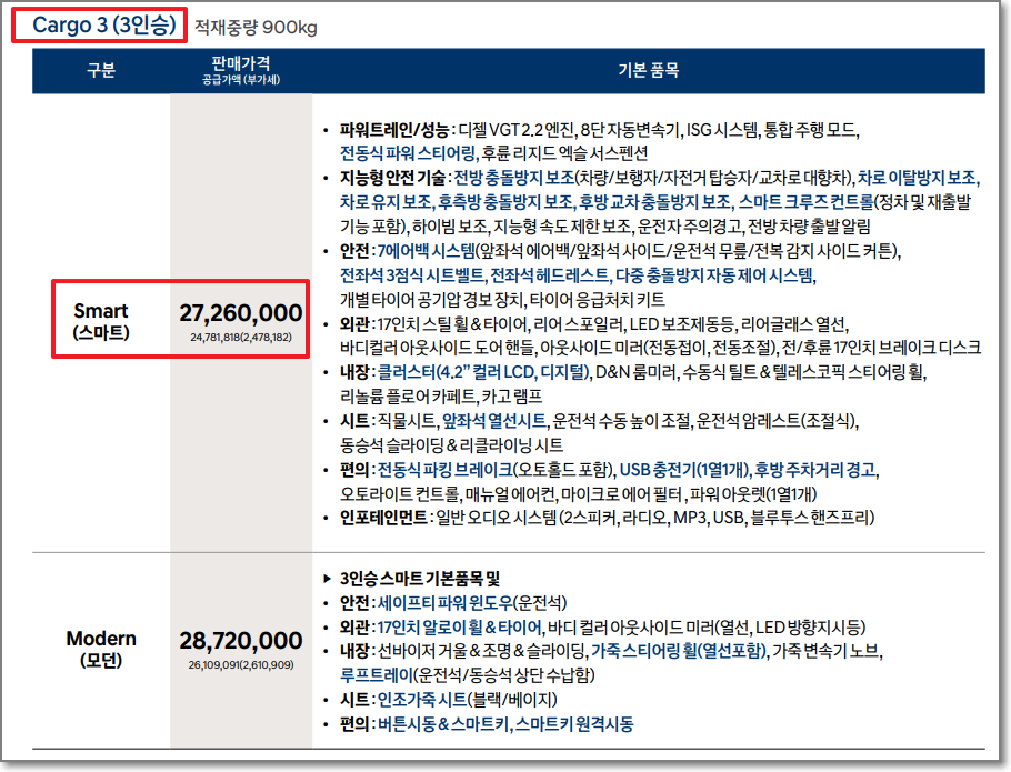 투어러 11인승은 특징이 110킬로에 리미트 제한이 걸려있다는 점 반드시 숙지하시고요. 스마트는 2932만 원, 모던은 3084만 원부터 시작을 합니다.