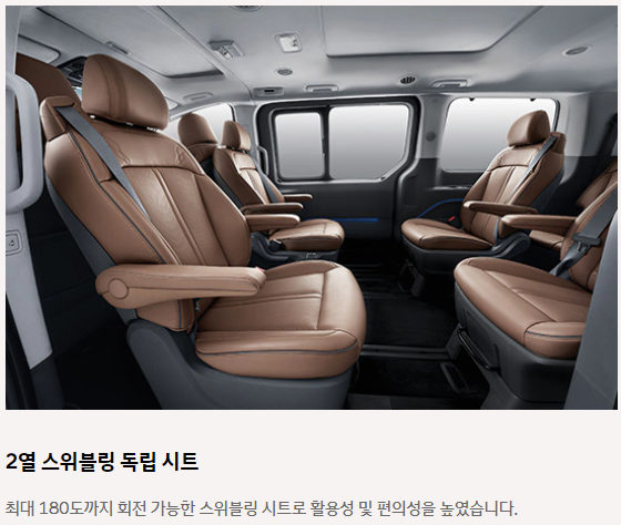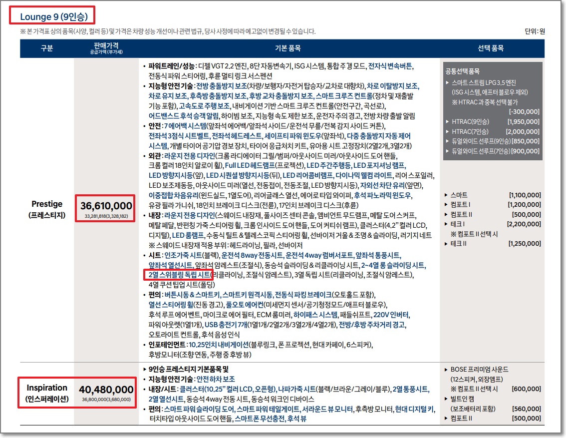 9인승의 경우 2열 스위블링 시트를 장착하였으며 3,661만 원부터 옵션에 따라 가격에는 차등이 있을 수 있습니다.