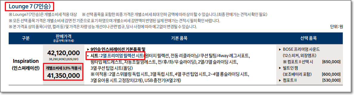스타리아 라운지 7인승의 경우 "2열 프리미엄 릴렉션 시트"가 기본으로 장착된 모델로서 개별소비세 3.5% 적용시 4,135 만원으로 가격이 책정되어 있습니다.