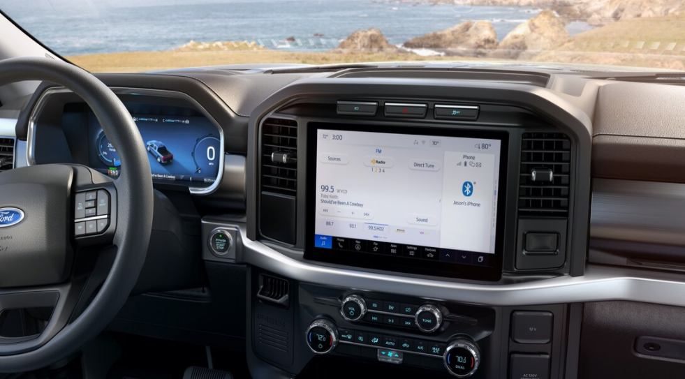 F150의 실내는 15.5인치의 세로형 터치스크린 디스플레이와 계기판 쪽에는 12인치의 디지털 디스플레이가 적용되었습니다. 메인 디스플레이를 통해서 안드로이드 오토나 애플 카플레이 같은 스마트폰 연동 서비스를 이용할 수 있으며 F150 차량에 기본적으로 아마존 알렉사를 음성인식 시스템으로 탑재했습니다. 계기판 쪽에서는 고속도로 주행 보조와 회생제동 발전량 등의 차량과 관련된 각종 정보를 제공합니다.