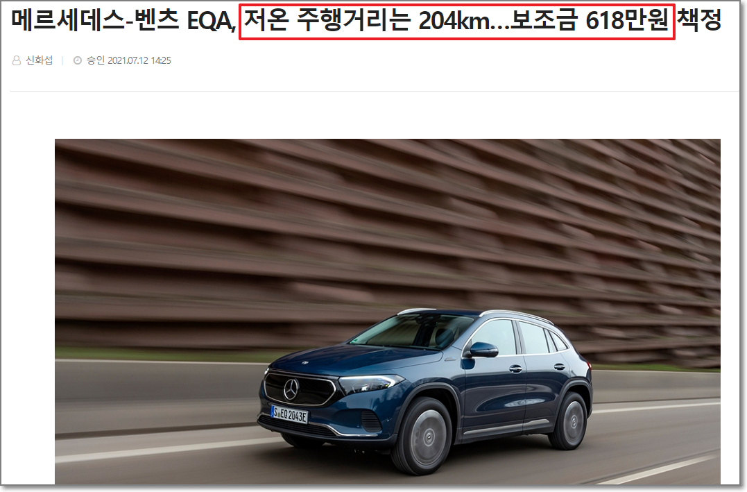 실제로 발표된 EQA의 저온 주행거리는 상온 기준으로 67%에 머물렀는데요. 이는 또 다른 문제를 발생시킬 수 있습니다. 상온 대비 저온의 주행거리가 모자라 6천만 원 미만의 전기차가 받을 수 있는 보조금 기준에 못 미치기 때문입니다. 그래서 최종적으로 해당 차량 구입 시 최대 금액인 8백만 원보다 182만 원이 적은 618만 원의 금액만 지원받을 수 있습니다. 이에 더해져 지자체 보조금도 줄어들기 때문에, 실제로 EQA 구입 시 지원받을 수 있는 금액은 더 줄어든다고 보시면 되겠습니다.