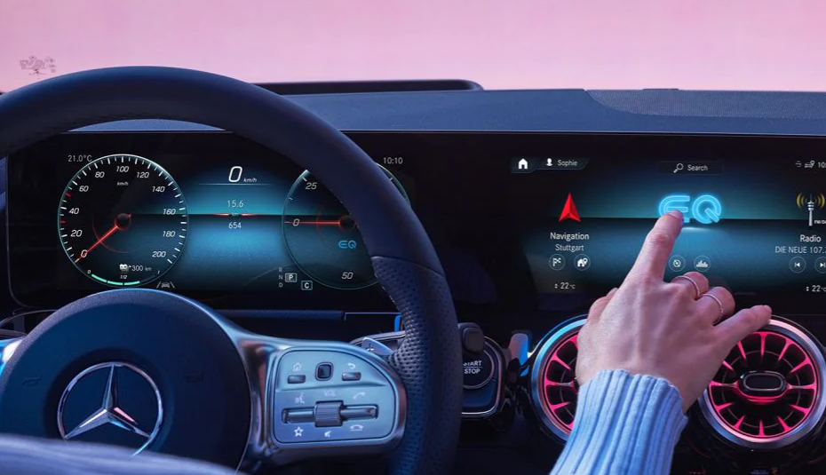 "안녕 벤츠"라고 말하면 MBUX 시스템은 마치 시리나 알렉사처럼 반응을 하는데요. 음성인식으로 차량의 기능설정이나 네비 검색 등을 할 수 있으며, 터치패드에 손으로 문자를 입력하는 겨등도 있고 디스플레이를 좋아하는 클래식이나 스포츠 중 원하는 디자인으로 바꿀 수도 있는 기능이 있습니다.