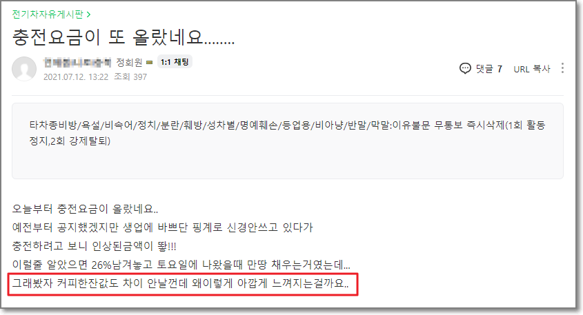 세계 각국에서 친환경 차량을 보급하기 위한 노력이 뜨겁습니다. 한국도 마찬가지로 환경 보호의 일환으로 전기차 보급 확대를 위한 각종 특례를 활용 중에 있는데요. 전기차의 수가 원활하게 늘어나는 추세에 본디 계획한 대로 적용되자 혜택들을 줄여나가는 분위기입니다. 그중 한 부분으로 얼마 전 7월 12일부터 전기자동차 충전 요금이 인상되었는데요. 기존 충전 요금보다 15~21% 오른 비용에 사용자들의 불만이 폭주하고 있습니다.