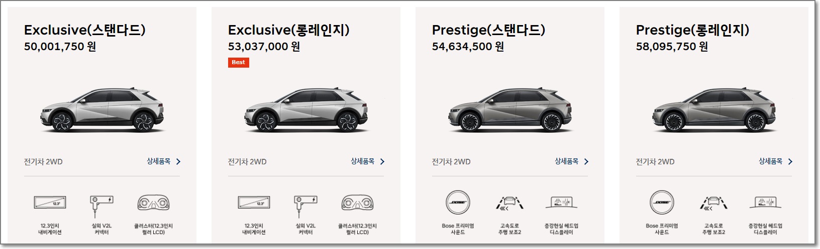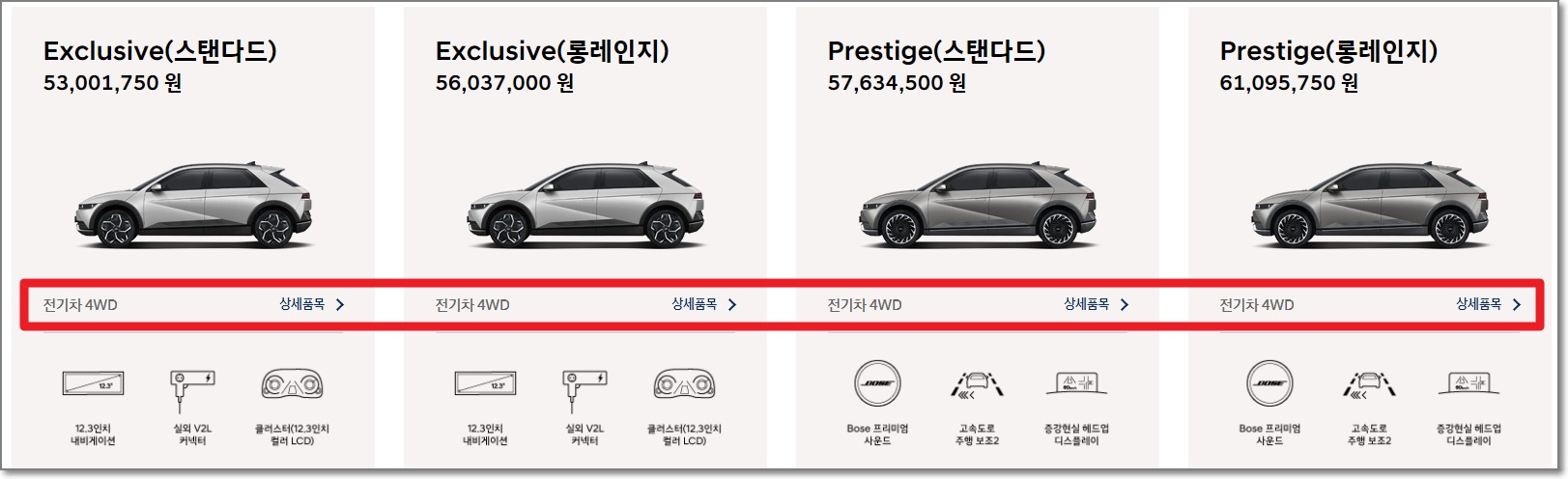 모델은 익스클루시브 스탠더드 2WD를 시작으로