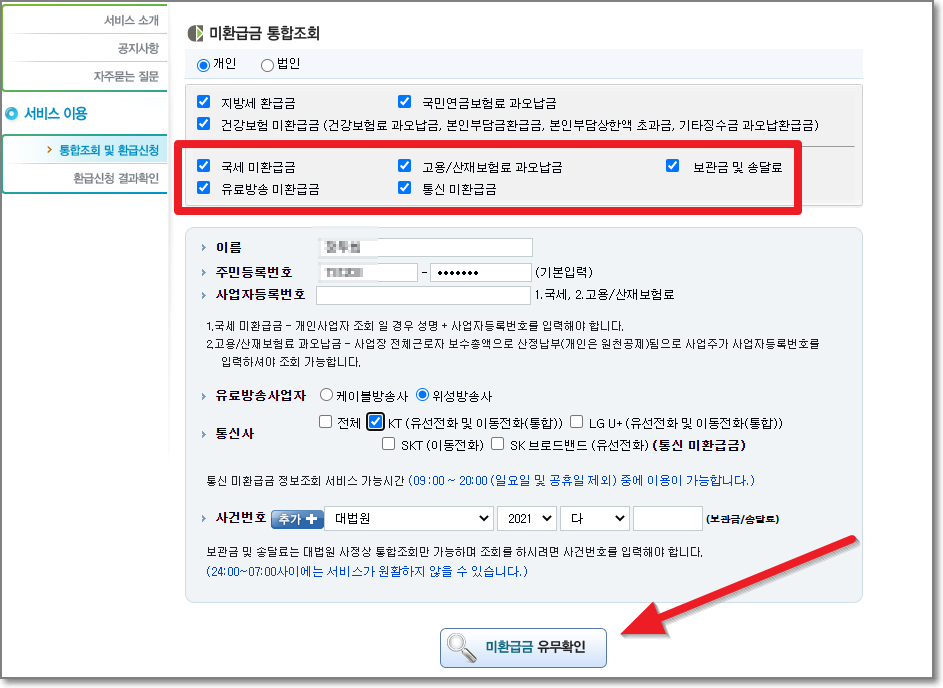 이름과 주민번호를 입력하고 "미환급금 유무 확인"을 누르면 됩니다.