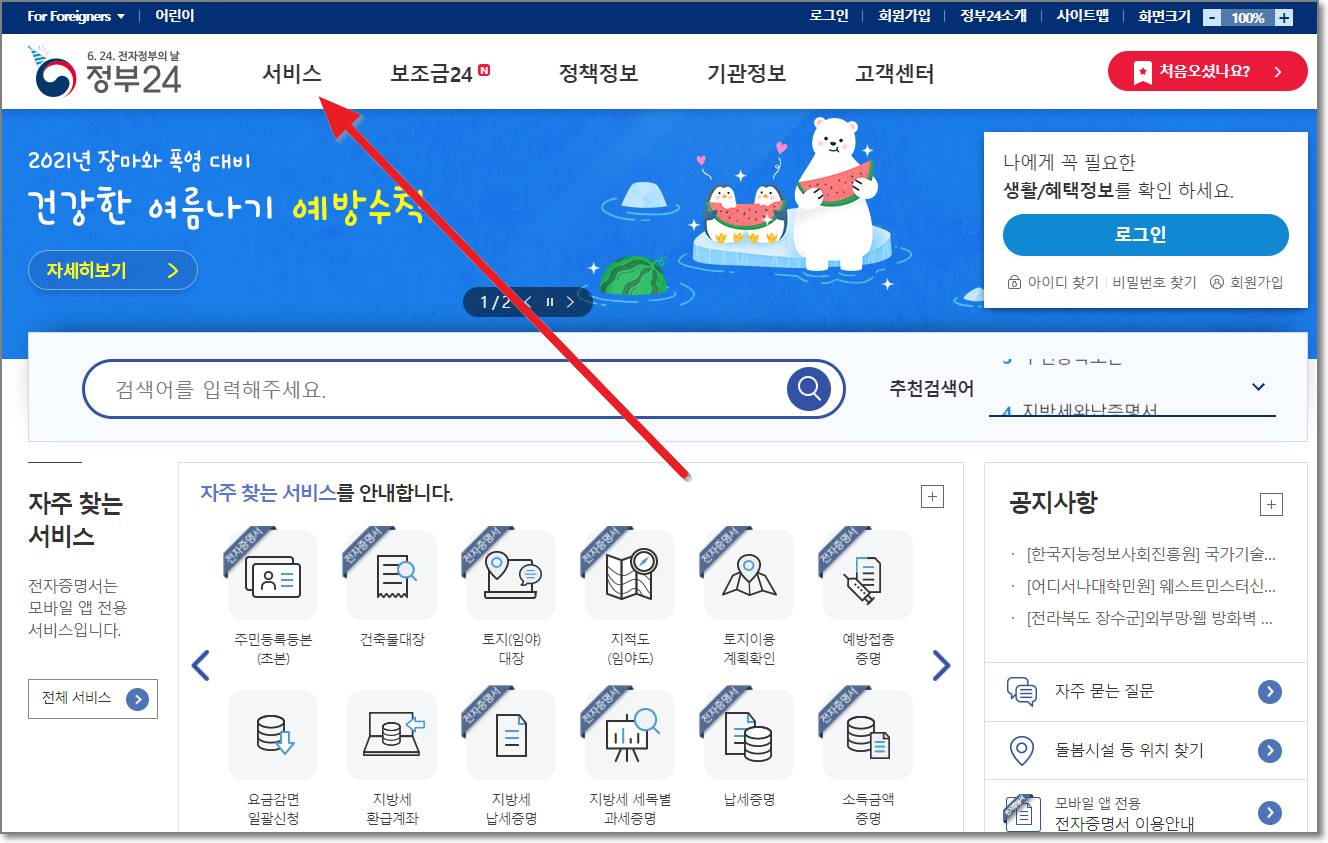 정부 24 사이트에 접속한 후 홈페이지에서 상단에 있는 "서비스"를 누릅니다.