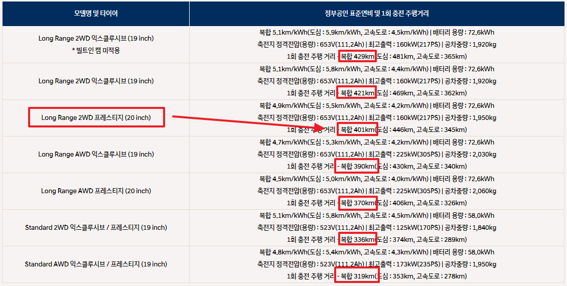 아래는 아이오닉 5의 주행거리인데요. 잘 보면 롱 레인지 프레스티지 두 바퀴 굴림 차량을 봤을 때 복합연비가 401km 나오는 것으로 보아 EQA의 주행거리는 크게 고려대상은 되지 않을 듯합니다.