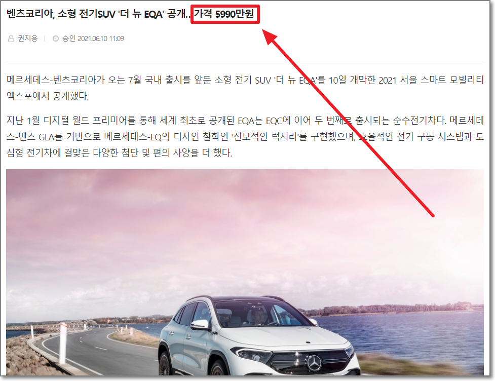 한편 EQA의 미국 가격은 55,300달러이며 이대로 환율을 적용하고 우리나라에 들어오는 가격을 감안하면 6천만 원이 훌쩍 넘어야 하지만 우리나라의 전기차 보조금 시장이 6천만 원 이하에게만 100% 지급을 해주고 있기때문인지 우리나라 판매 예상가격은 5990만 원으로 책정되었습니다.