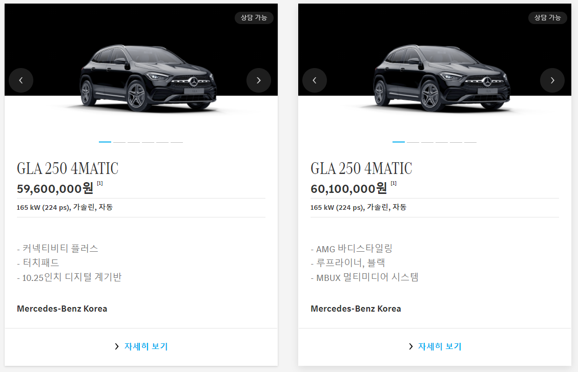 직접적인 비교를 위해서 겉모습이 거의 비슷한 GLA 250모델을 보면 5960만 원, 6010만 원에 판매가 되고 있는데요.