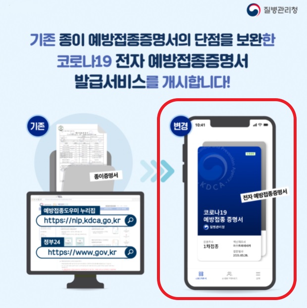 코로나19 예방접종증명서 인터넷 발급(종이), 전자증명서 발급(휴대폰)