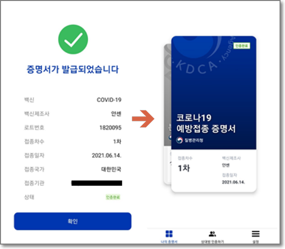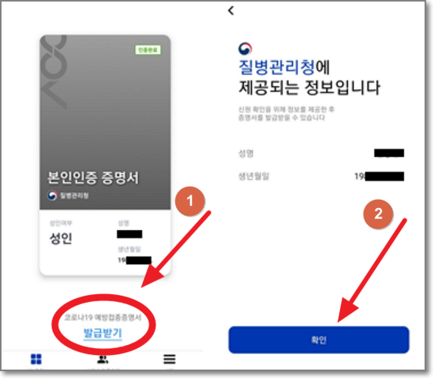 본인인증이 완료되면 "예방접종증명서"를 발급받고 자신의 이름과 생년월일이 맞는지 확인 후 "확인"을 누릅니다.