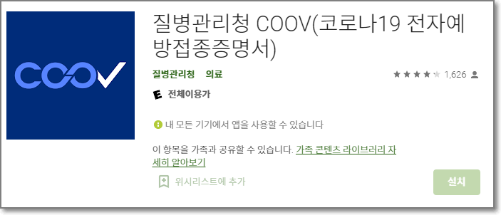 전자 예방접종증명서를 발급하려면 앱스토어나 구글플레이에서 "질병관리청 COOV(코로나19 전자 예방접종증명서)"앱을 설치하고, 본인인증을 거치면 전자 예방접종증명서 발급이 됩니다.