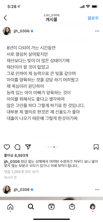 이어 "저희는 서로에게 상처를 주었기에 다시는 돌아갈 수 없다고 판하여 각자의 길을 가기로 선택하였습니다."라며 이혼 하게 되었음을 밝혔는데요. 외질혜는 "제 능력과 제 상황으로 인하여 아이는 매일 볼 수 있는 조건으로 아이 아빠가 양육하기로 하였습니다"라며 딸의 양육은 철구가 하기로 했다고 밝히고 "재산 분할에 관해서 재산보다 빚이 더 많은 상태라며, 대부분 제 명의로 한 것은 제 신용도가 좋아 대출이 나오기 때문이었으니 오해하지 말아 주셨으면 좋겠다"라고도 밝혔습니다.
