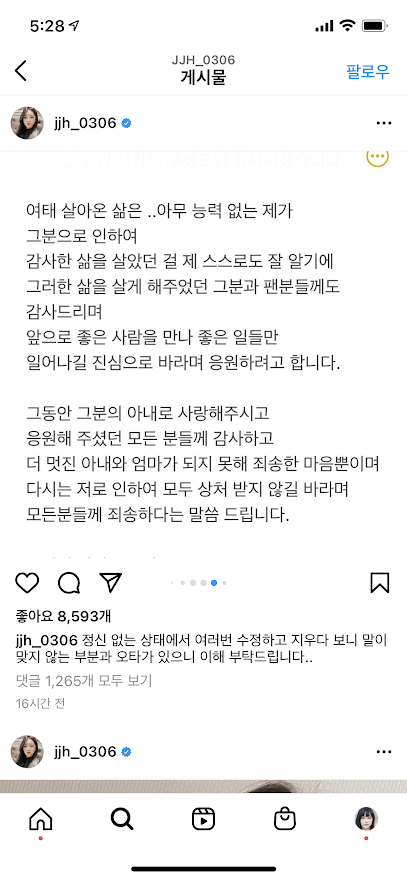 그동안 그분의 아내로 사랑해주시고 응원해 주셨던 모든 분들께 감사하고 더 멋진 아내와 엄마가 되지 못해 죄송한 마음뿐이며 다시는 저로 인하여 모두 상처 받지 않길 바라며 모든분들께 죄송하다는 말씀드립니다.