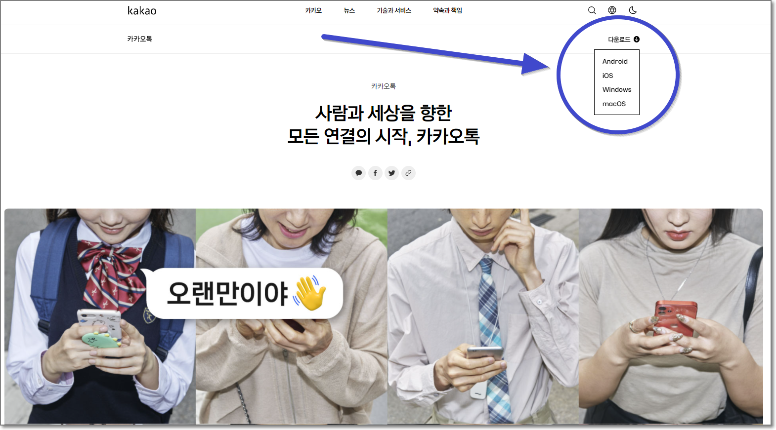 우선 KaKao를 들어가서 우측 상단에 있는 "다운로드"에 마우스를 가져다 대고, 자신의 운영체제에 맞는 항목을 골라서 누릅니다. windows로 하시면 많은 분들이 제대로 되실 것입니다. (자신의 PC가 맥이라면 macOS를 누르시면 됩니다.)