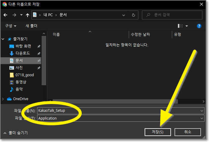 "다른 이름으로 저장"에서 KaKaoTalk_Setup을 확인하고 "저장"을 누릅니다.