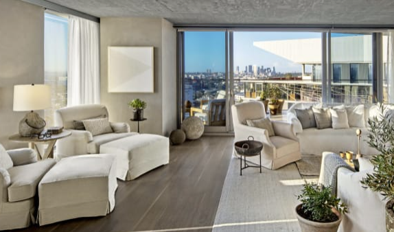 전염병이 발생하기 몇 달 전인 2019 년에 개장 한이 객실은 소박한 미니멀 한 장식, 호화로운 대리석 욕실, 헐리우드 힐스의 비할 데없는 전망을 갖춘 로스앤젤레스 전역에서 가장 크고 고급스러운 객실입니다.