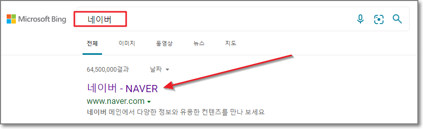마이크로소프트에서 만든 검색엔진인 Bing(빙)에서도 검색창에 "네이버"라고 입력하면 최상단 결과에 네이버 바로가기가 나옵니다.(개인적으로 검색엔진 이름이 한국에서도 조금 놀림감이 되지 않을까 생각합니다. 빙~ㅅ)