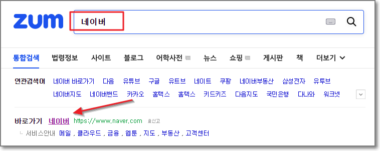 또한 요새 뜨고 있는 ZUM에서도 검색창에 "네이버"라고 입력하면 네이버로 바로 갈 수 있는 링크를 볼 수 있습니다.