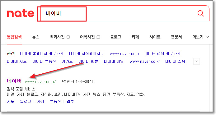 다음 다음으로 많이 찾는 네이트(nate)에서도 검색창에 "네이버"라고 입력하면 결과에 네이버를 바로 갈 수 있도록 나옵니다.