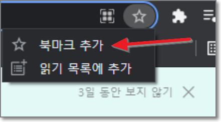 속이 비어있는 별을 누르면 "북마크 추가"와 "읽기 목록에 추가"라는 항목이 보일 텐데요. 여기서 "북마크 추가"를 누릅니다.