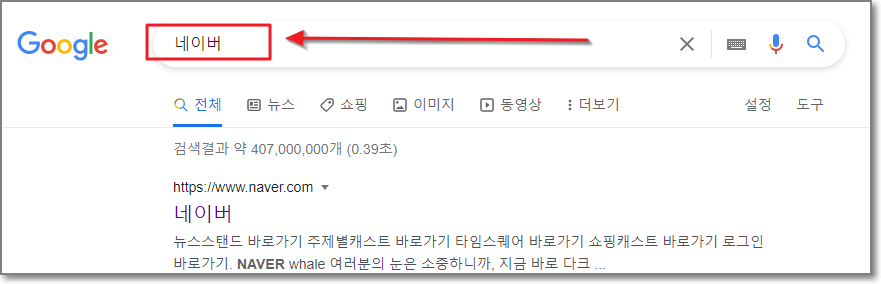 인터넷 검색의 황제라고 하는 구글에서 검색창에 "네이버"라고 쳐도 되며,
