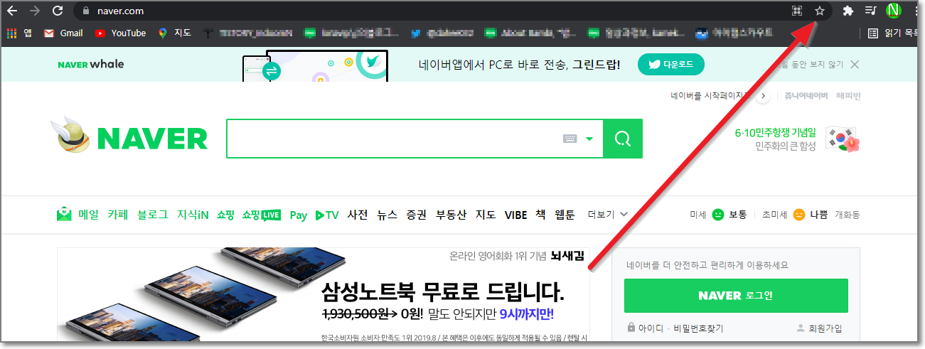 우선 네이버에 위의 방법들로 접속을 한 다음에 화면 우측 위에 있는 별 모양(북마크)을 누릅니다.