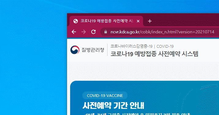 바탕화면에 만들어놓은 바로가기가 제대로 실행되는지 해보겠습니다. 방금 위의 방식으로 만들어놓은 바로가기는 바탕화면에서 두 번 누르면 바로 예방접종 사전예약 시스템으로 접속이 됩니다.